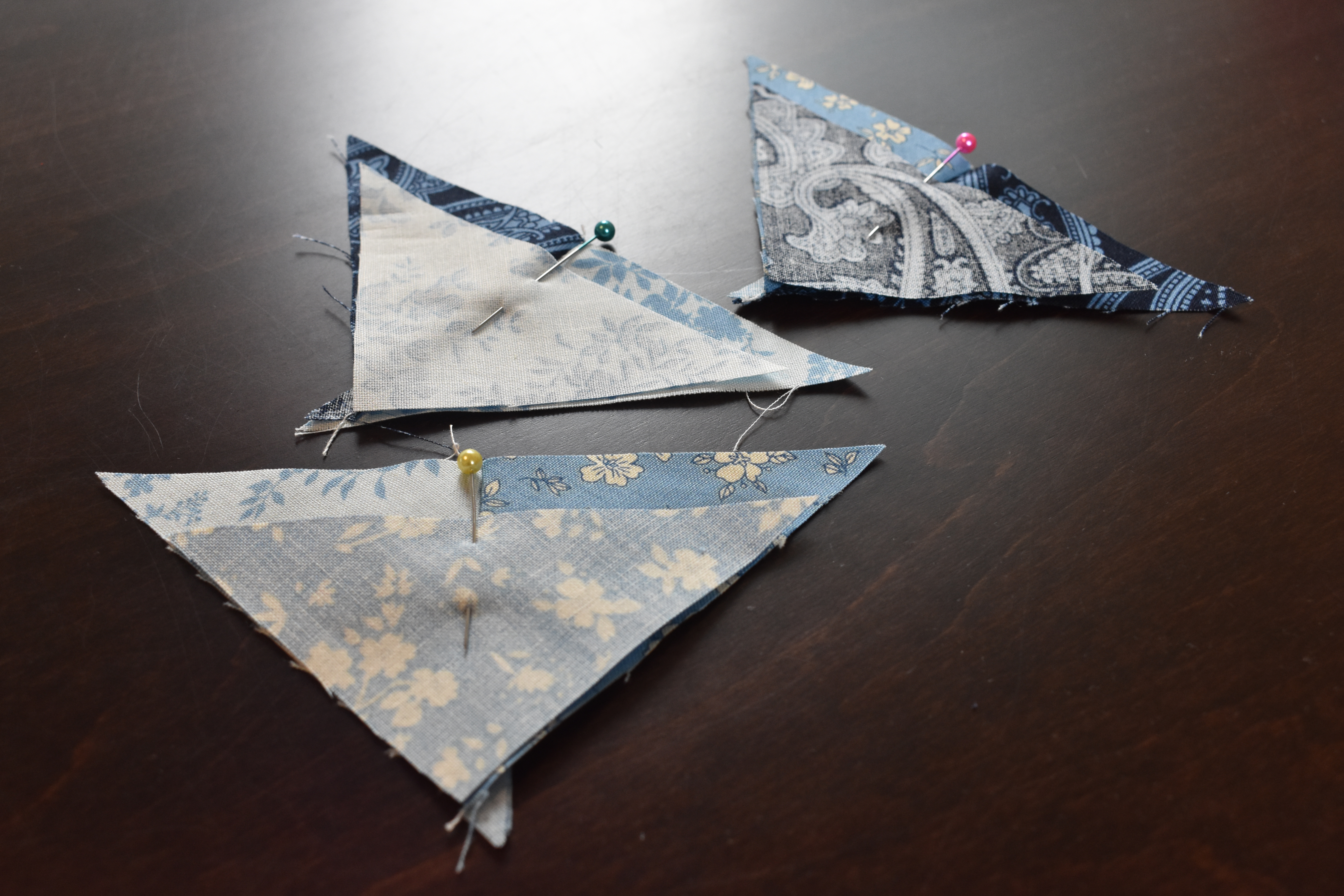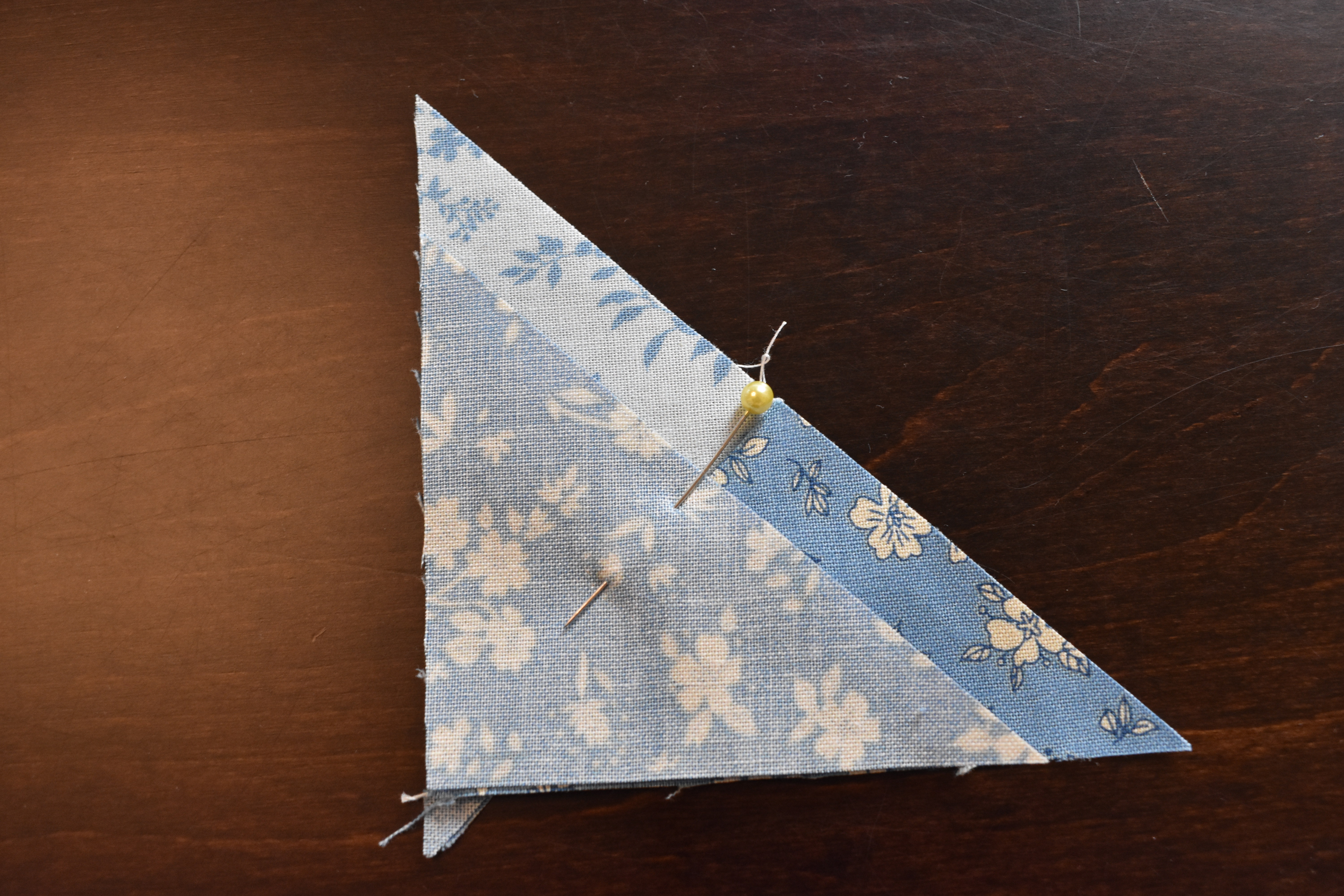 Now you will pin the single triangle on top of the double triangles to  complete the square.  Line up the triangles as pictured below.  You will have a lot of extra seam that you will trim after sewing.