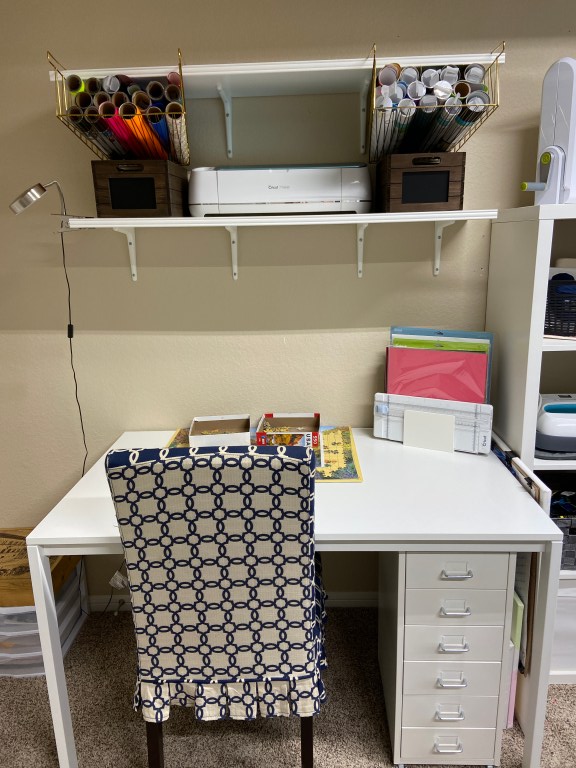 Next, I wanted a second desk for my daughter to craft and also for Cricut projects. We purchased the same table as we did for my sewing space for symmetry purposes. We also added two shelves above that table for symmetry and added storage.