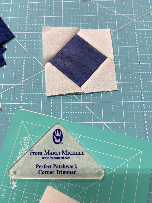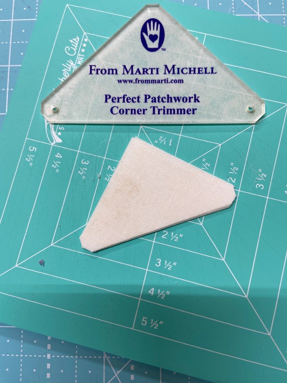 The Perfect Patchwork Corner Trimmer. This really helped me line up my triangles with the squares.