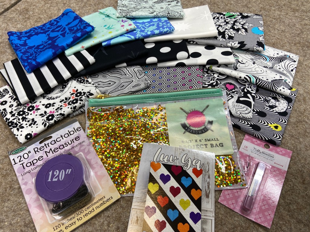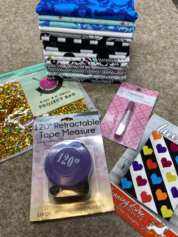 In my excitement I forgot to take photos of individual notions, But, I did receive some binding needles, a tape measure, a pattern, and a fun glittery project bag in this box.