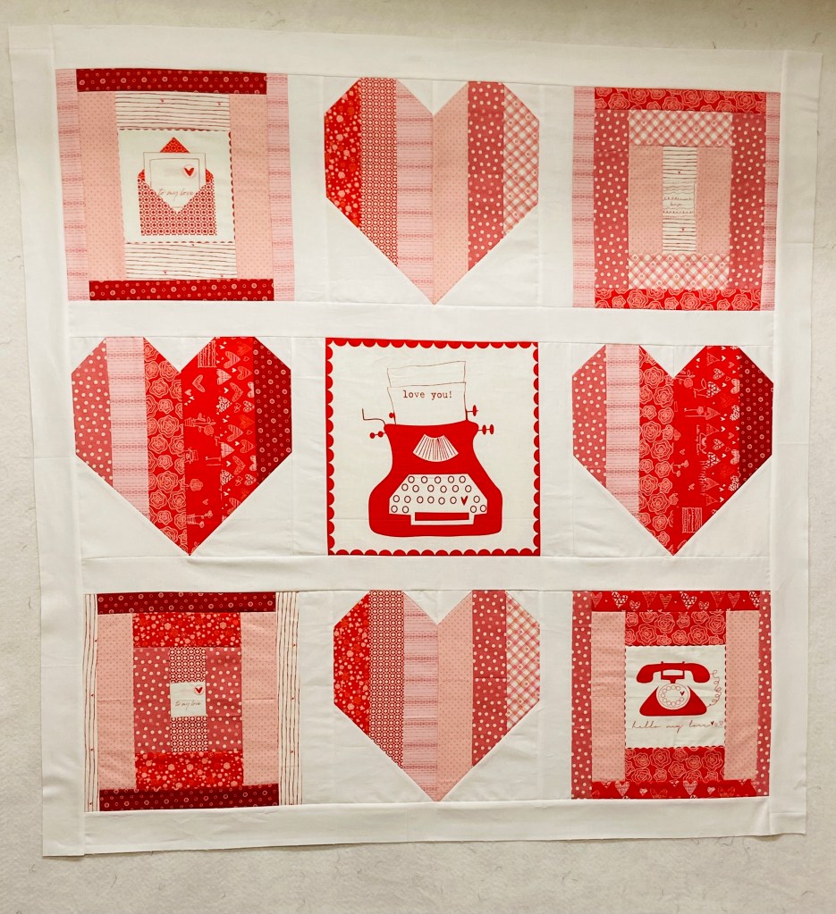 The quilt is made up of a main panel piece from the Cupid box, and then surrounding that panel are heart blocks and blocks reminiscent of courthouse steps blocks. I added sashing and a border from the white background fabric I used.