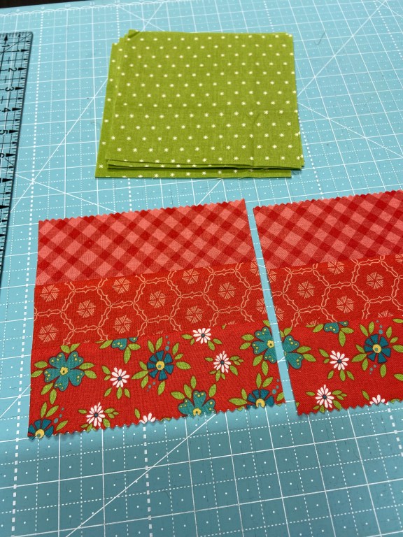 You will first cut your two contrasting fabrics into 10″ squares.