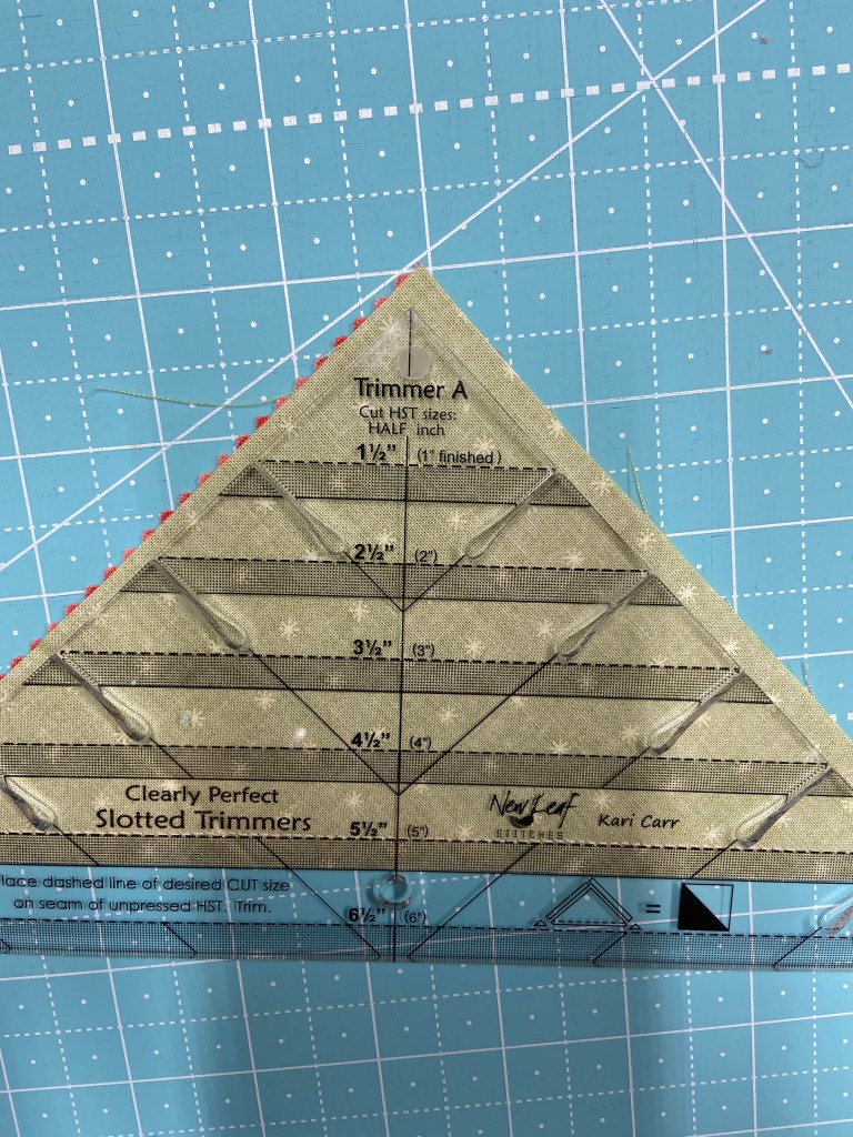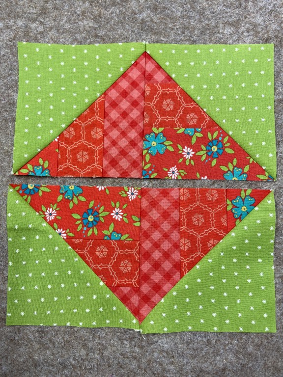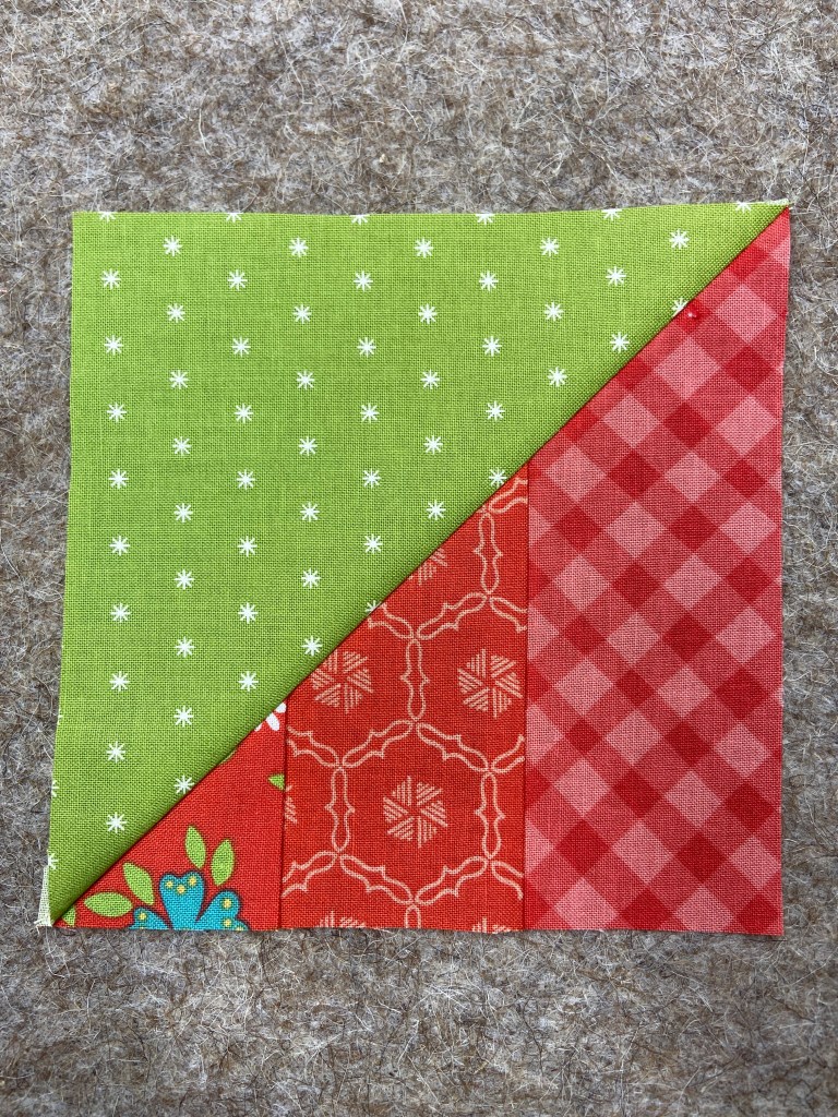 The diamond block that I am making today is made using strips of fabric on one side of the HST (half square triangle). You can make this block using traditional HST’s as well.