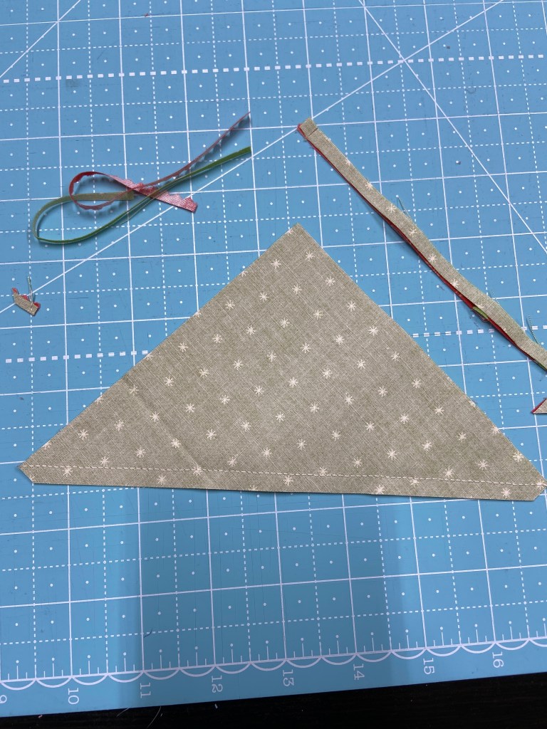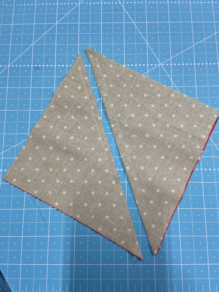 Now you will cut your squares in half corner to corner. It is ok if you cut through a few threads they will open easily when you open them.