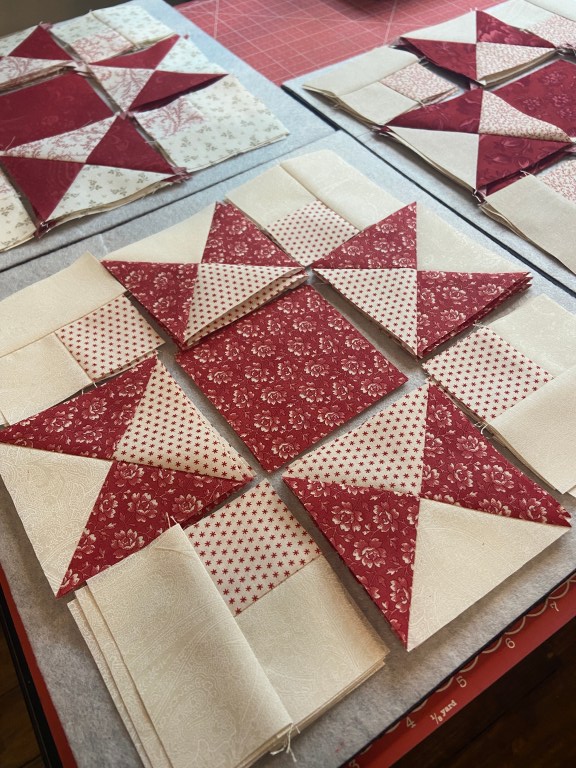 I also use design boards to lay out my blocks and bring them to the sewing machine for sewing. I love this method because I find it helps me keep organized better, which means less seam ripping! I can also stack the boards and get more sewing done in one sitting this way! That means I am working more efficiently and can finish my projects faster!