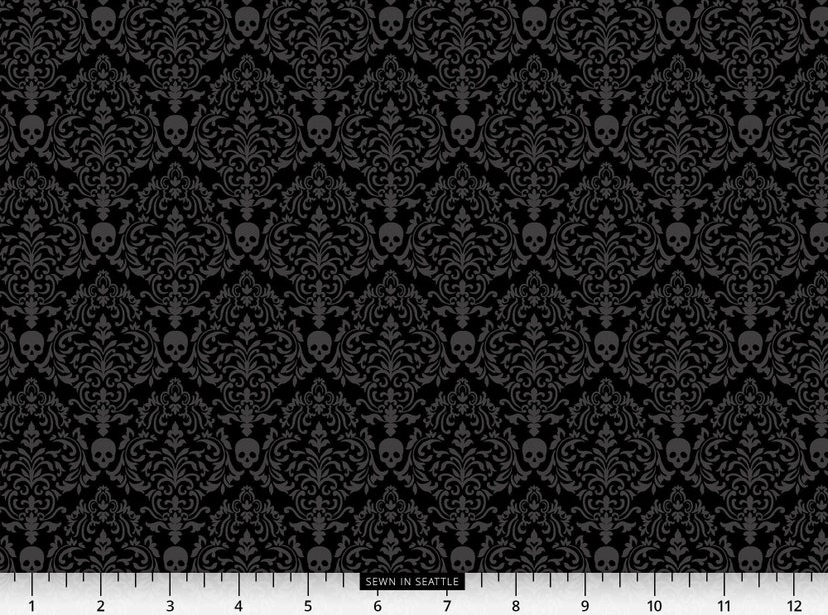 Damask pattern with skulls on black.