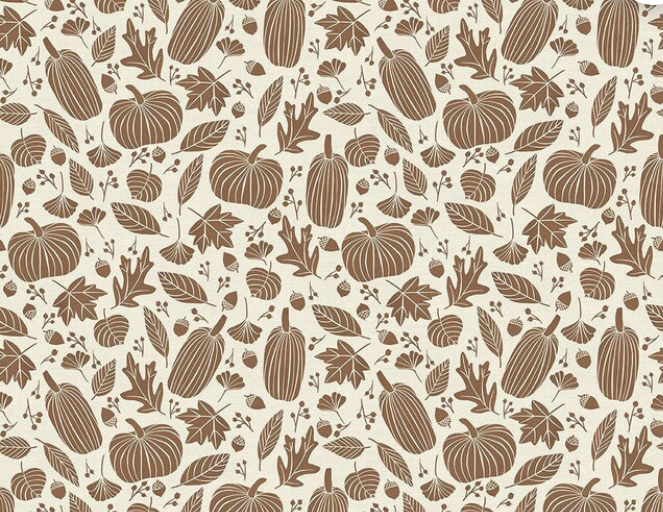I just adore this print by Paintbrush Studio Fabrics. I love the simplistic feel to it. There are just two colors and that is it, however, you still get a lot of fall in this one print. There are acorns, pumpkins, and a lot of fall leaves and foliage. I love that the placement of all of the design elements are well thought out. So much of this fabric is covered in Fall elements. I also really like that the pumpkins are different shapes as well. If I was in the market for just one Fall fabric it would have to be this one!