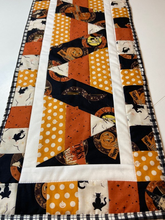 I really wanted to make a Halloween Table Runner this year, and I knew I wanted to incorporate a candy corn quilt block. It can honestly take a bit of time cutting out template pieces, so I made the amount of blocks needed minimal and added some patchwork borders to add a little extra width to the overall size!